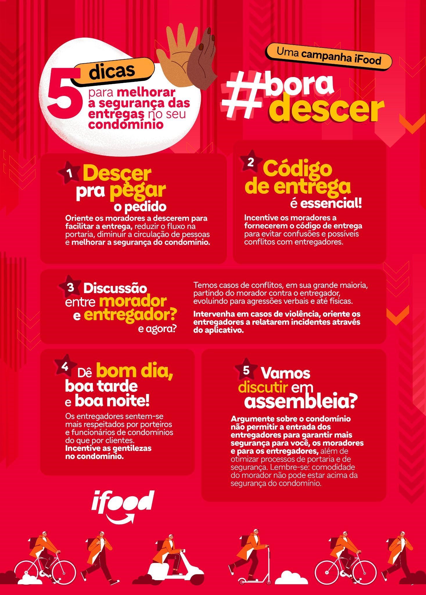 O iFood, empresa brasileira de tecnologia e líder em delivery, iniciou a ação #BoraDescer durante o carnaval da cidade do Rio de Janeiro com o objetivo de conscientizar os clientes do app para que desçam para buscar seus pedidos, como um ato de gentileza e respeito com os entregadores.