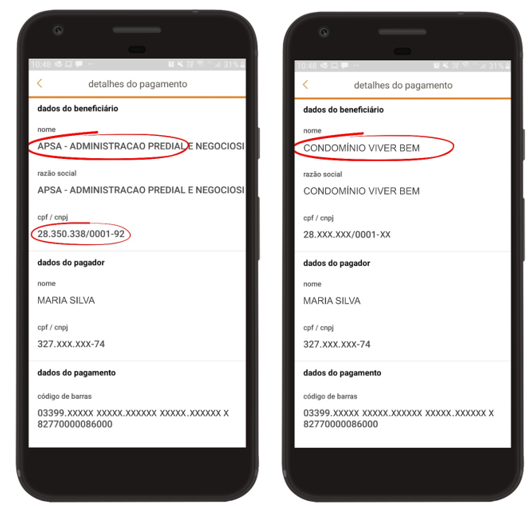 Ao realizar o pagamento do boleto, é preciso verificar nome e CNPJ do beneficiário, que pode ser a APSA ou o seu CONDOMÍNIO.